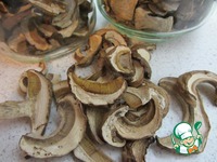 Добавить к замоченным грибам сушеный корень петрушки, измельчив его руками или в ступке. Петрушку сушила сама, нарезала овощечисткой - тонкая стружка легко ломается и быстро разбухает в воде. |