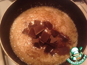 • Когда сахар полностью растворится, добавляем поломанный шоколад. Помешивая, растопим его. Сотейник снимаем с огня, шоколадную массу слегка остужаем.