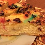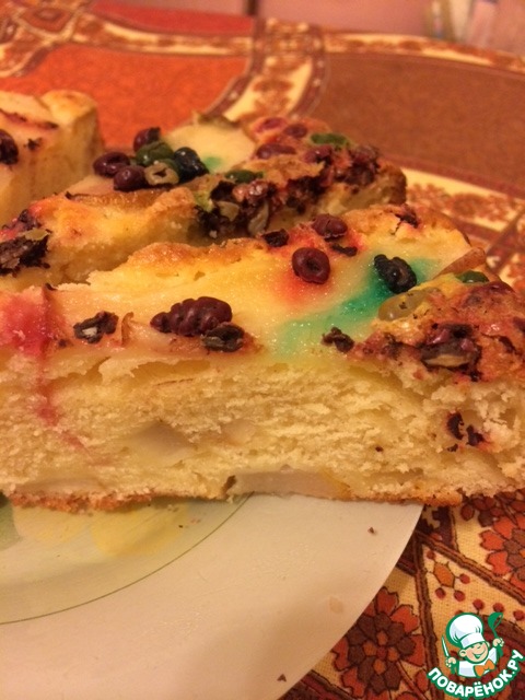 Мороженые фрукты\ягоды тесто держит великолепно (они не будут опадать на дно пирожка). Я в этот раз сделала с грушей (внутрь бисквита положила кусочками нарезанную грушу, а сверху - тонкими ломтиками) и шоколадной цветной крошкой.