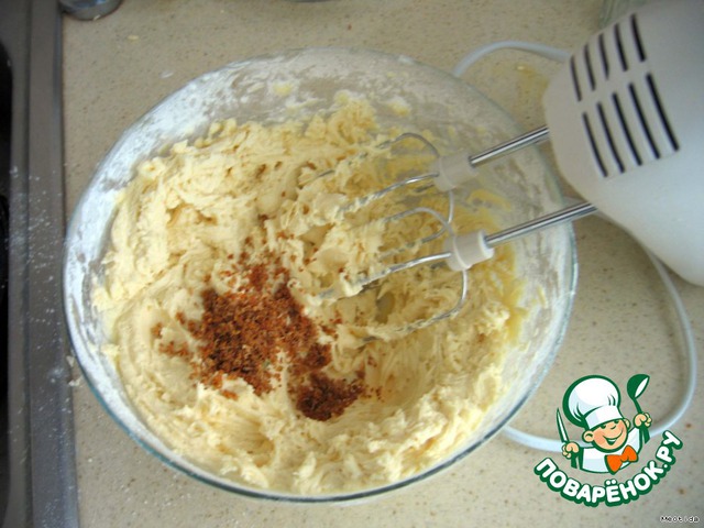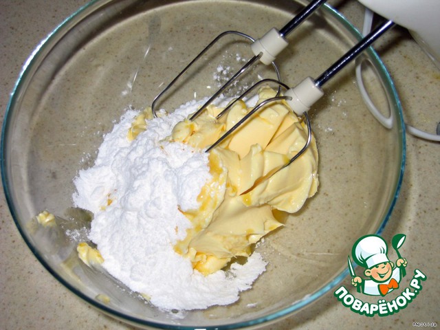До светлой и воздушной массы взбить сливочное масло сахарной пудрой.