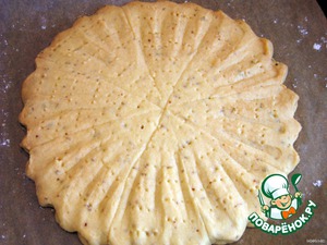 Нанести на поверхность коржа нанести ножом бороздки, разделив его на треугольники. Вилку обмакнуть в муку и сделать наколы