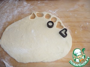 От теста взять небольшой кусочек, обвалять слегка в муке, раскатать в пласт и формочками для теста сделать вырезы.