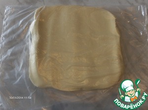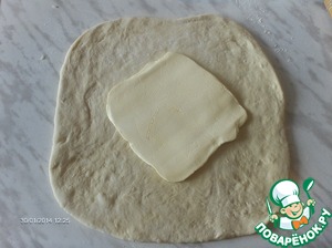 По истечении времени достаем тесто из холодильника и раскатываем его квадратом, не тонко, мм 6 толщиной и посередине положить квадрат из маргарина.