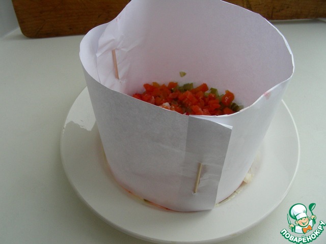 Затем повторяем все компоненты и смазываем верхний слой майонезом.