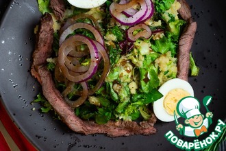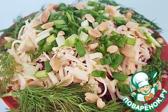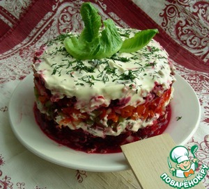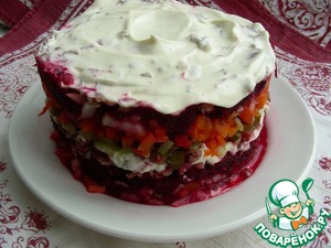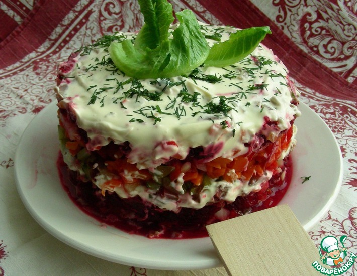 Когда-то, в конце 70-х, моя свекровь работала на рынке - выдавала билеты и весы, рубила мясо, мыла столы и прилавки, мела территорию, в общем, вкалывала, как все, целый день. А поскольку жили в Казахстане, то и работники рынка были разной национальности: и русские, и казахи, и уйгуры. А обедали все вместе и, чтобы не нарушить традиции, готовили этот интернациональный салат. Он почти как "шуба", только с говядиной, сочный, вкусный и любимый членами нашей семьи до сих пор. Рецепт записан в старенький блокнотик и бережно храним моей свекровью.
