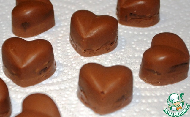 Конфетки получились с дырявыми боками, только из-за того, что поленилась бока формы хорошо смазать шоколадом , но ничего, все съели . Теперь все учту и позже постараюсь выложить фото "нормальных" конфеток.