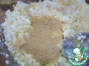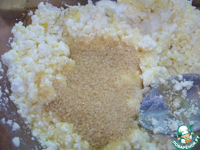 Масло растапливаем, остужаем, смешиваем его с творогом, ванилью и 3 ст. ложками сахара.