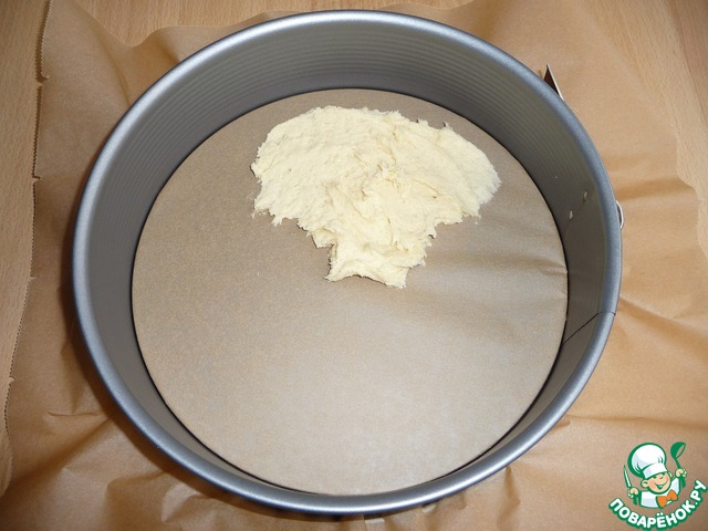Взять разьемную форму, застелить пекарской бумагой, выложить тесто.
