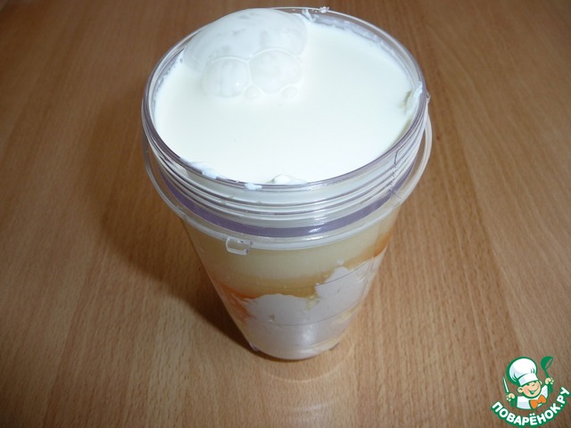 Готовим творожно-сливочную смесь. В блендер загружаем творог, яйца, сахар, сливки, ванилин. Все взбить.