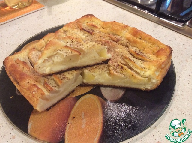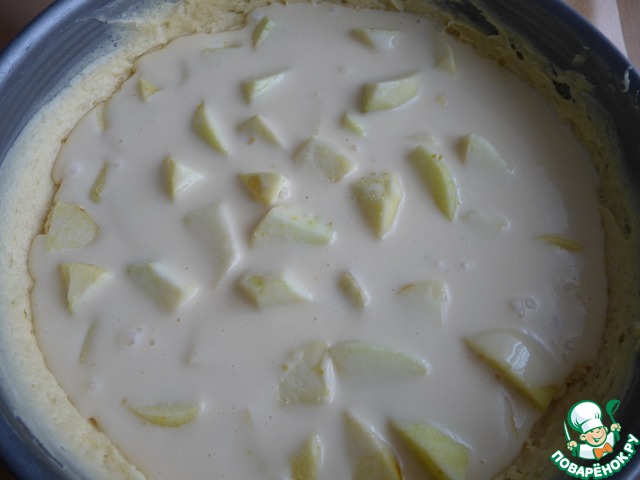 Вот что получилось. Середина пирога будет мокрая, так и должно быть. При полном остывании пирога заливка схватится. -