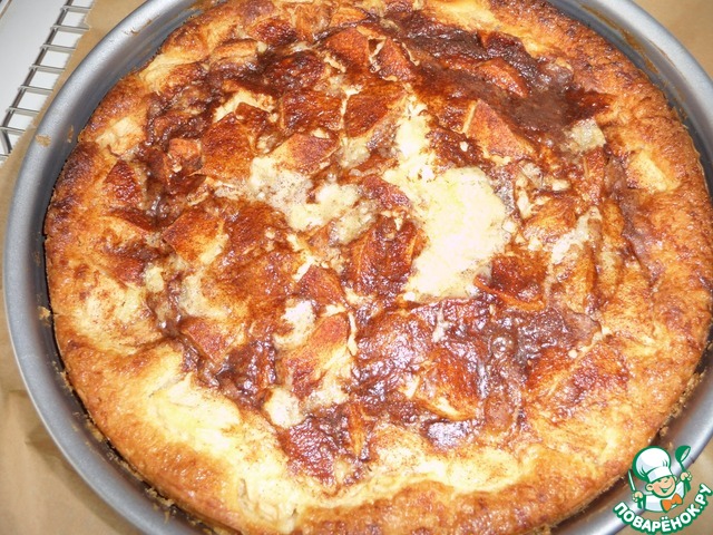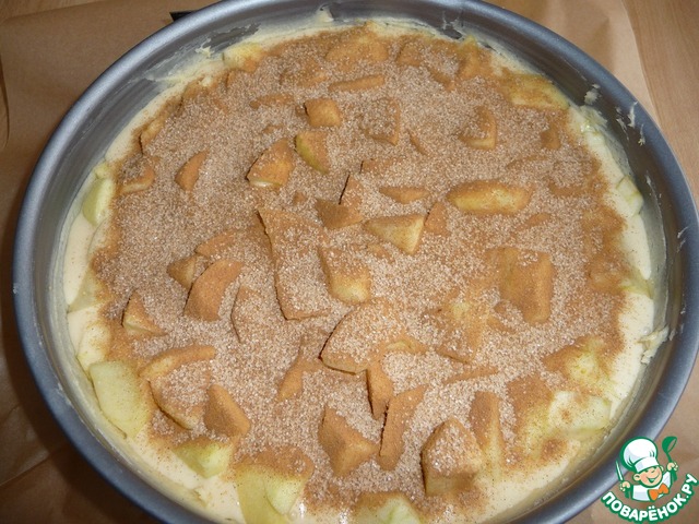 Распределить сверху остатки яблок и творожный крем. Смешать корицу с сахаром и обильно посыпать пирог.