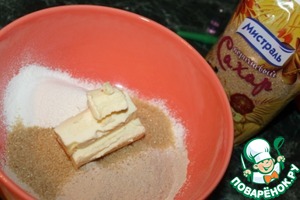 В миску просеять обе муки, добавить сахар и сливочное масло.