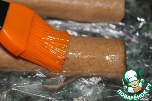 Тесто разделить на 2 части и из каждой скатать валик, убрать в морозилку на 30-40 мин, предварительно завернув тесто в пищевую пленку.