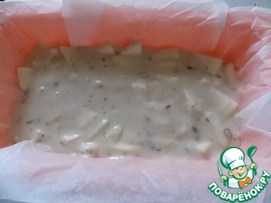 Добавить яблоки в тесто и перемешать. Форму (даже силиконовую) выложить пекарской бумагой. Положить тесто. Поставить в духовку на 25 мин при t=180 до полуготовности кекса.