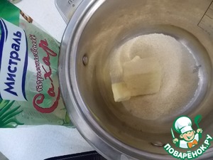 Через 10 минут, после того, как поставили в духовку кекс, делаем наш крустильян. Для этого соединяем масло и сахар в кастрюльке и растворяем на медленном огне до однородной массы. (Если в процессе сахар растает, но не будет смешиваться с маслом, добавьте чуть-чуть горячей воды.) Снять с огня и немного остудить.