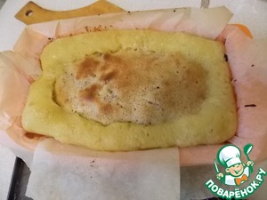 Через 25 мин. вынимаем кекс. Ставим t на 230, заливаем кекс сверху заливкой и еще на 10 мин в духовку. За счет высокой t корочка становится хрустящей. (Это он уже после 5 мин. в духовке, сразу забыла показать.)