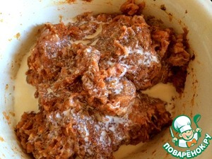 Готовим фарш. У меня - курица + свинина. Добавляем к мясу лук, чеснок, специи (паприка, черный перец, карри, кориандр, мускатный орех) и сливки. Перемешиваем.