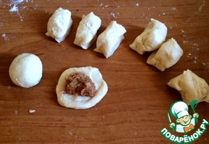 Когда тесто готово, отщипываем часть и нарезаем небольшими кусочками. Размер - чуть больше грецкого ореха. Большие кусочки не стоит делать, так как тесто при жарке очень увеличивается в размерах. Разминаем кусочек и кладем немного фарша в серединку, защипываем края, формируя шарик. Обваливаем каждый шарик в муке. Затем окунаем его в наш острый соус!