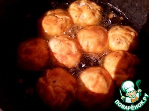 В сковороду наливаем побольше масла (как на фритюр). На огне, чуть больше среднего, обжариваем шарики со всех сторон до золотистой корочки. Шарики маленькие - прожариваются быстро (минуты 3)