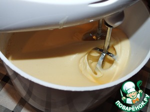 Теперь смешиваем творожную и сметанную массы, и тонкой струйкой вливаем желатин. При этом постоянно взбиваем.