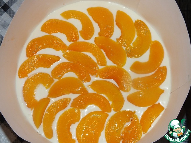 Далее накрываем вторым коржом. Я накрыла не сразу, поставила форму с тортом на полчаса в холод, чтобы крем немного схватился, и только потом накрыла коржом. На корж выкладываем оставшиеся дольки персика. Делаем желе и заливаем им торт.