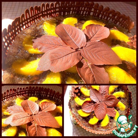 Шоколадные листья я делала заранее. Ничего сложного в изготовлении шоколадных листочков нет, зато смотрится такое шоколадное украшение очень оригинально. Для шоколадных листочков нужны плотные небольшие листья и силиконовая киcтoчкa. Нужное количество листьев моем, хорошо обсушим. Растопленный шоколад наносим кисточкой на ту сторону листа, на которой более отчетливо видны прожилки, тогда шоколадные листья будут выглядеть более рельефно. Можно просто обмакивать листья в растопленный шоколад. Полученные листики охлаждаем в холодильнике и аккуратно отделяем шоколадные листочки.