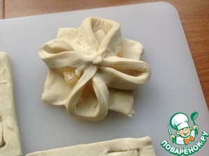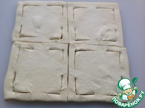 Тесто разморозить, не раскатывать, разрезать на квадраты и сделать надрезы как на фото