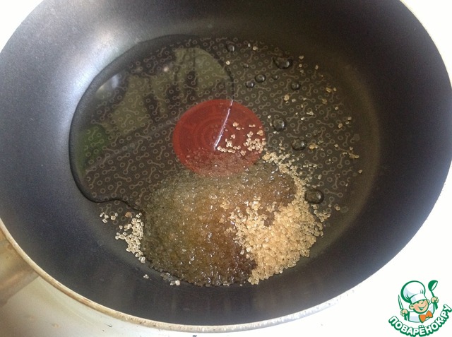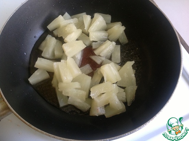 В сковороду вылить 2 ст. л. сиропа из банки с ананасами, добавить 1 ст. л. сахара и при постоянном помешивании довести до кипения
