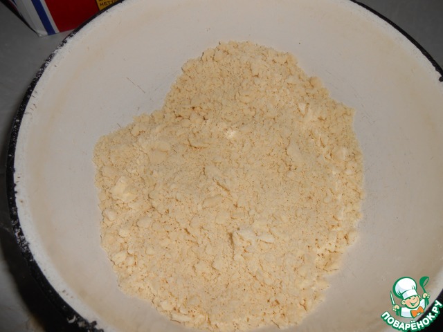 Маргарин с 1 стаканом муки растираем в крошку, можно сделать это руками или порубить муку с маргарином ножом.