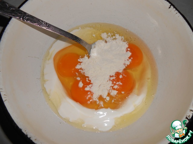 Сметану, яйца, 1ст. л. муки смешиваем до однородного состояния. Добавляем соль, рубленую зелень. -