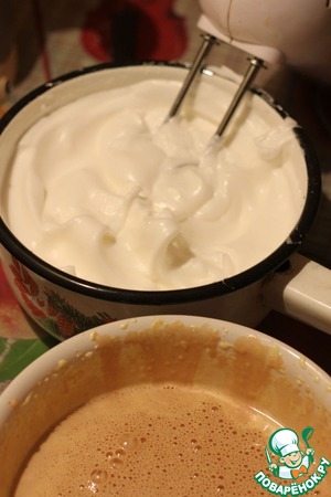 Пять белков взбейте со 100 г сахара до устойчивых пиков. Аккуратно смешайте белковую массу с желтково-шоколадной.