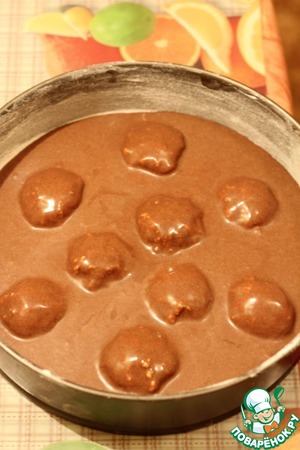 Теперь я смешала просеянную муку, какао, соду, соль и крахмал. Затем получившуюся массу струйкой всыпаю в белково-желтковую массу, не переставая при этом аккуратно перемешивать. Тесто готово. Выложить его сверху творожных шариков. Форма у меня была слишком большого диаметра, я этого не учла, поэтому теста маловато было. Когда будете готовить - выберете для этого случая подходящую форму или заготовьте побольше теста. Выпекать в заранее разогретой духовке до 180 С, минут 30-40 на среднем уровне