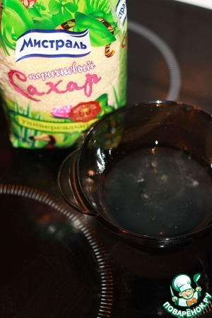 Теперь приготовим меренгу. Нам опять понадобится 200 г сахара коричневого ТМ "Мистраль". Сварим сироп из сахара и воды. Пусть покипит пару минут.