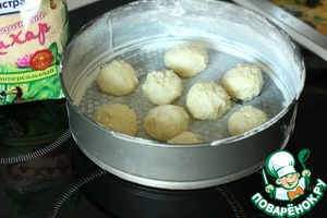 Мокрыми руками сформируйте шарики и выложите их в форму для выпечки торта. У меня разъемная, на всякий случай смазала ее сливочным маслом и присыпала мукой. Отложить пока в сторону.