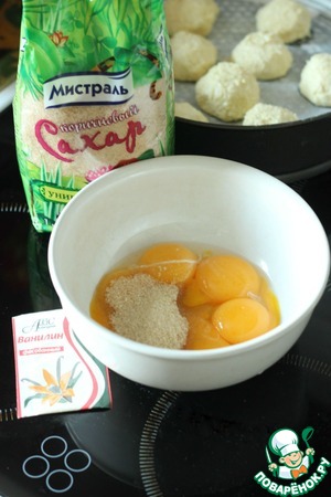 Теперь приготовим тесто. Нам понадобятся 5 яиц, отделите белки от желтков. Желтки взбить с 50 г коричневого сахара и ванилином