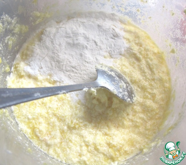 Добавить молоко, апельсиновое пюре, перемешать. Всыпать муку с разрыхлителем. Слегка взбить миксером.