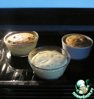 Налить в противень воды, поставить в него формочки и выпекать при температуре 180 градусов около 30 минут. Если верх слишком быстро зарумянивается, накрыть его фольгой.