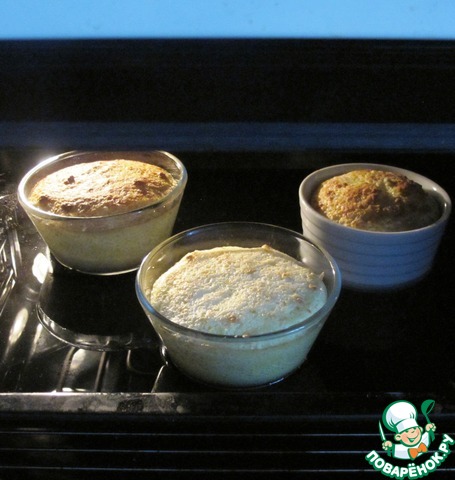 Ввести взбитые белки и перемешать ложкой, круговыми движениями. Жаропрочные формочки смазать маслом и заполнить на три четверти.