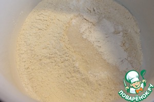 В чаше миксера смешать муку, соль, сахар и разрыхлитель
