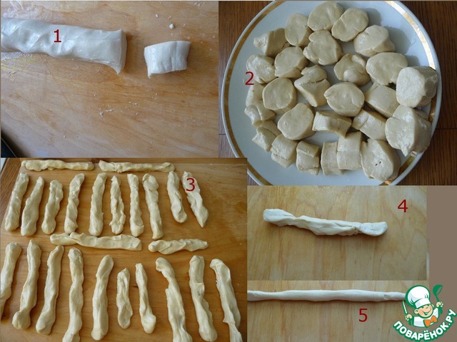 Берем одну заготовку и начинаем, слегка вытягивая, пропускать через пальцы немного подкручивая тесто. Сворачиваем спиралью и даем отдохнуть (фото 3) 10-20 мин., тесто все время должно быть прикрыто влажным полотенцем.