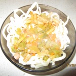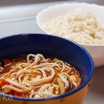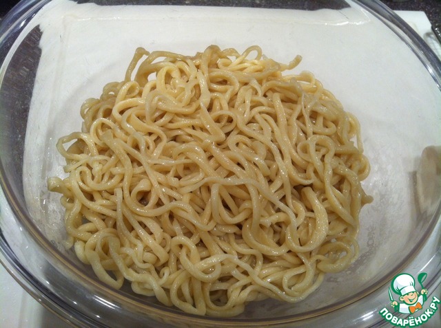 Опускаем лапшу по одной в кипящую воду. Проварить 2 мин., выловить щипцами для лапши или вилкой в дуршлаг, промыть холодной водой, сложить в большую миску, смазать растительным маслом, чтобы лапша не слипалась. -