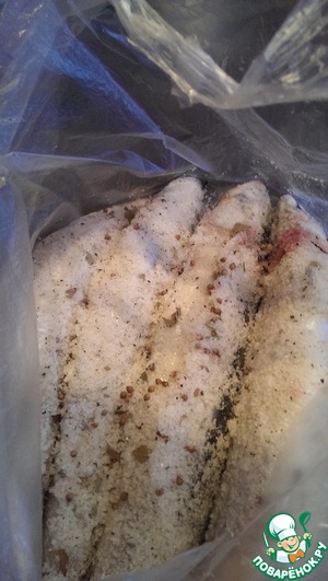 И теперь самое интересное! берем мешок полиэтиленовый и складываем в него хорошо натертую смесью рыбу. Вот мои четыре солдатика в ряд))) Этот мешок хорошо заворачиваем и ставим в другой мешок, более прочный. Затем весь этот пакунок обворачиваем пищевой пленкой! - чтобы не поступал воздух к рыбе, да и сама рыба будет сок пускать, чтобы он не вытек из мешка и не сделал сюрприз в холодильнике. (У меня такое было, теперь и пленкой пользуюсь)