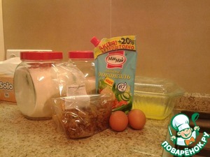 3. В полученную массу добавить ранее растопленный маргарин/масло, майонез, маргарин, муку, соду. Хорошо мешать, добавить начинку. У меня изюм (не забудьте промыть или залить кипятком ранее, вобщем, кто как обычно делает)
