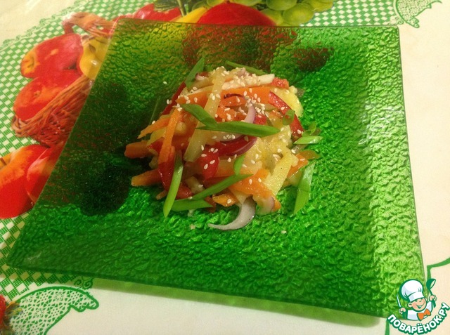 Добавляем свежемолотый перец, соль, сахар, оливковое масло и уксус, хорошо но аккуратно все перемешиваем. Украшаем кунжутом и зеленым луком. Мой супруг просит еще добавить мелко рубленый чеснок, но это не обязательно.