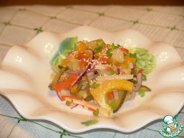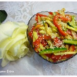 Очень вкусный и ароматный салат с кунжутом и овощами. Легкий, но в то же время достаточно сытный. Из доступных продуктов и легкий в приготовлении. Пикантность салату придают соленый огурец и кислое яблоко, но... Остальное вы узнаете, попробовав этот салат. Кстати, это мой 100 рецепт - юбилейный, надеюсь, не самый худший.