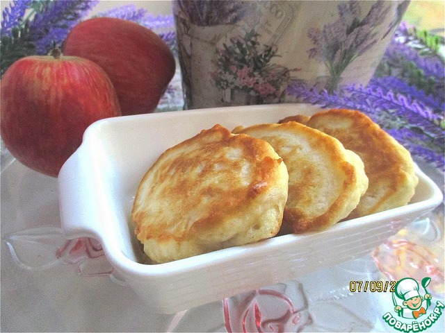 По этому рецепту готовила мне оладушки всегда моя бабуля. Очень нежные, совсем не жирные, румяные оладьи. Если хотите чувствовать яблоки в оладьях, то нужно добавлять натертое яблоко вместе с кожурой, если хотите получить более нежный вкус, то без:) Расскажу, как легко натереть нечищенное яблоко без кожуры. Также взвесила все ингредиенты и рассчитала калорийность - получилось 149 ккал на 100 гр. Для оладий это совсем немного:) Один мой средний оладушек весит 30 гр