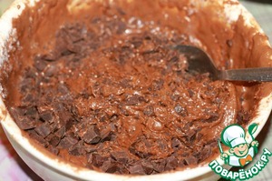 Шоколад 170 г разрубить на кусочки среднего размера, не мелкие, и добавить их в тесто, все перемешать