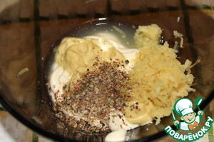 В большой миске смешать сметану, горчицу, тертый имбирь, сок из одного лимона, обильно поперчить и посолить.