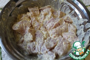Опустить в эту массу филе индейки, нарезанное небольшими кусками (приблизительно 3 на 3 см), оставить мариноваться минут на 30.