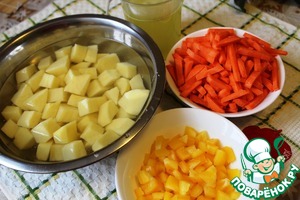 Пока индейка маринуется, нарезаем крупными кубиками картофель, мелкими - перец, морковь - брусочками.